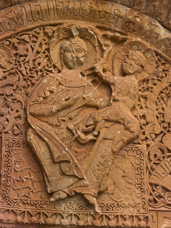ciekawy tympanon nad wejściem do kościoła - Matka Boska przedstawiona na modłę wschodnią - siedząca na dywanie