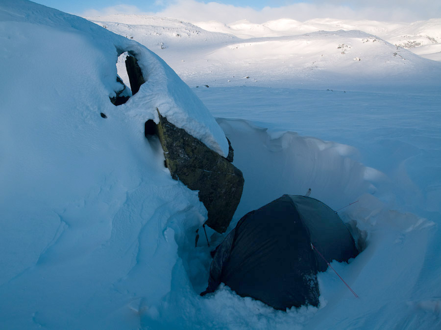 dzień się kończy, a wiatr nie cichnie - bojąc się o całość namiotu staram się maksymalnie schować przed podmuchami