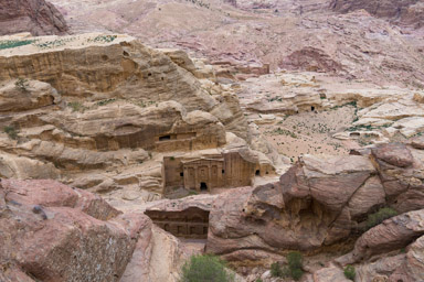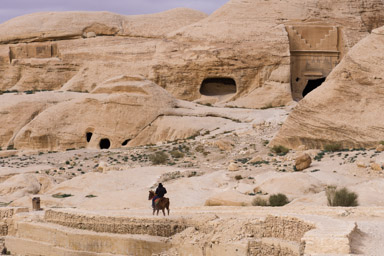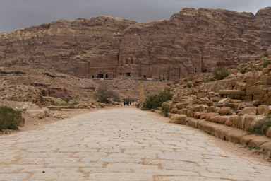 w tle grobowce nabatejskie, na pierszym planie ruiny rzymskiej świątynii i pałacu