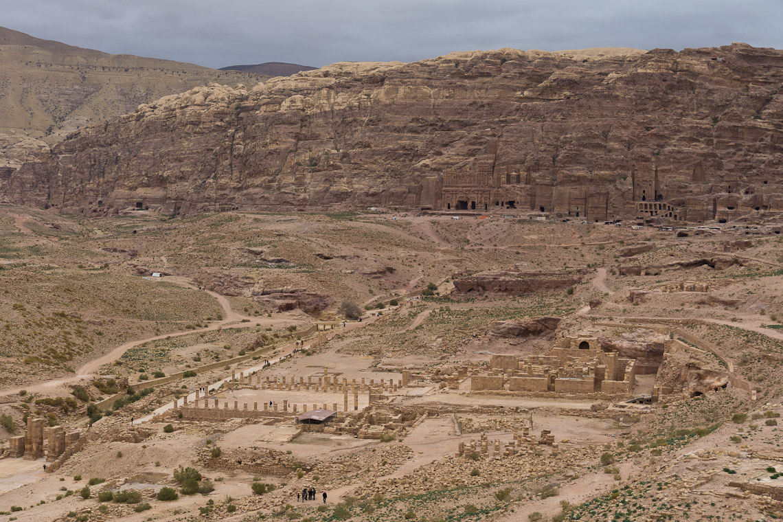 w tle grobowce nabatejskie, na pierszym planie ruiny rzymskiej świątynii i pałacu