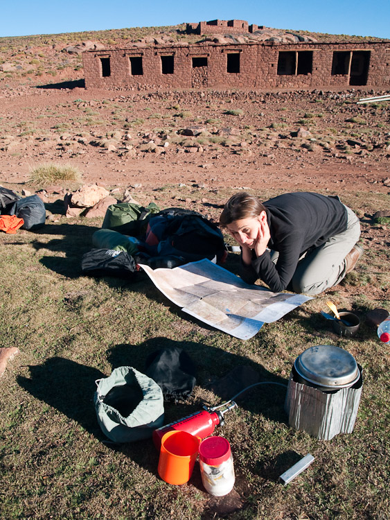 poranne planowanie trasy - w tle owczarnia (?) za której murkiem rozbilismy się na noc