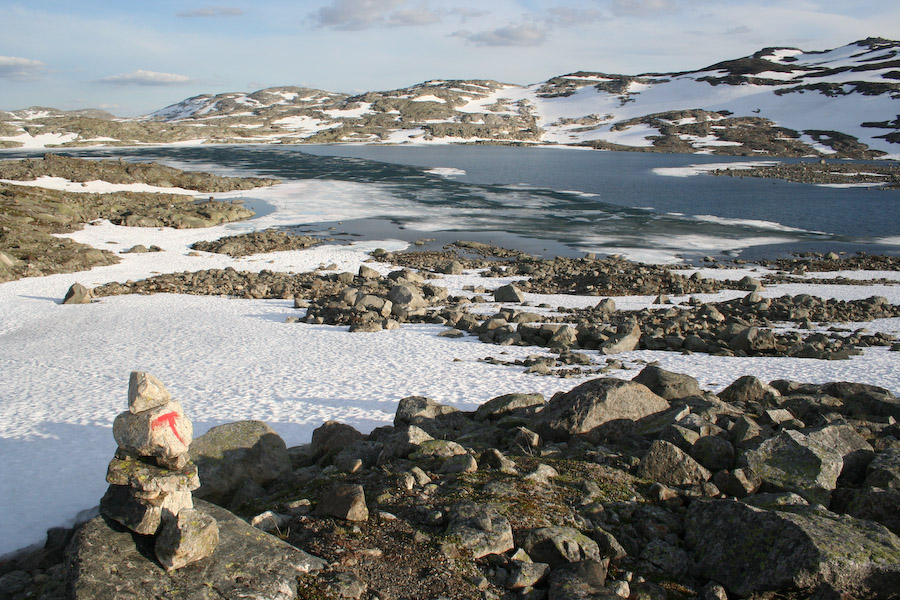 w Norwegii szlaki w górach znakowane są kopczykami kamieni, oraz czerwoną literą "T"