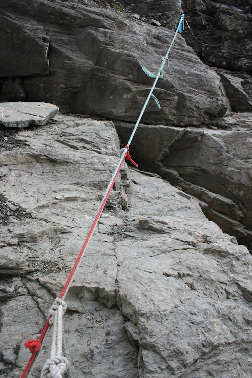 to już sama wspinaczka na szczyt - miejsca kluczowe (półki podcięte dwustumetrową zerwą) "ubezpieczone" są w sposób urągający wszelkim zasadom bezpieczeństwa. Cóż... Norwedzy to twardy naród i byle czym się nie przejmują...
