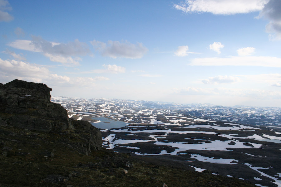 a teraz nagroda: widok ze szczytu; wokoło tylko śniego, woda, skały