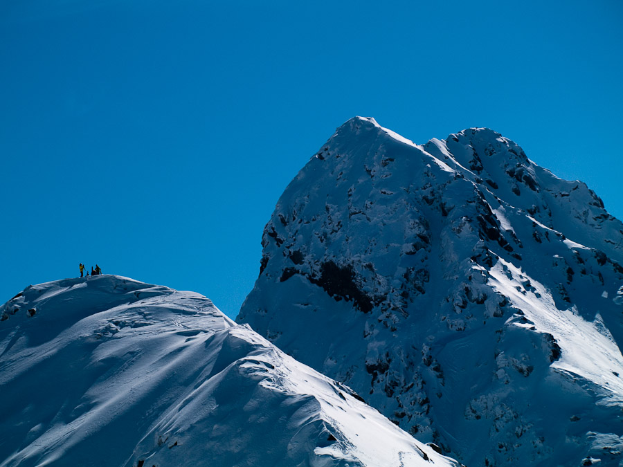 na Pośredniej Turni już widać amatorów freeride'u, w tle Świnica